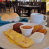 1 Omelette de jamón, frijoles volteados, salsa ranchera, 2 lascas de platano, queso, dos panes...
